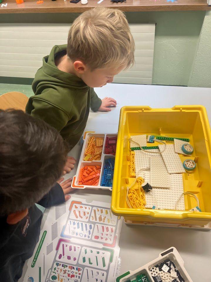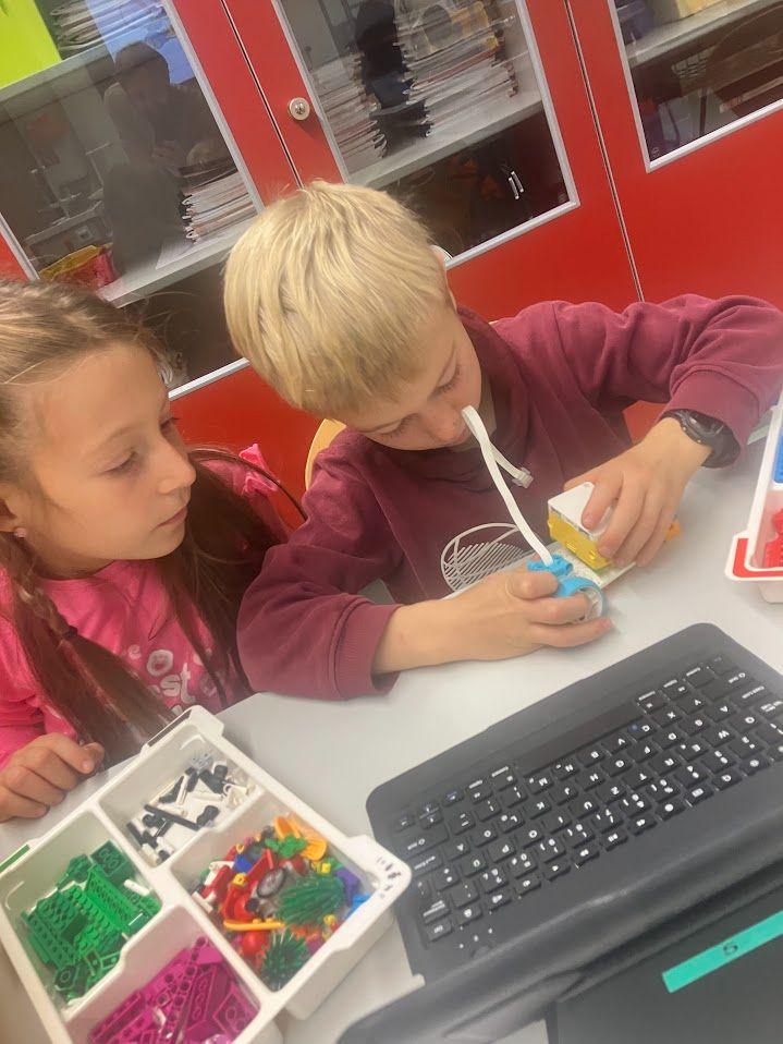 Zu Beginn bauten die Kinder ein Schneemobil, das sie anschließend mit einfachen Programmierbefehlen fahren lassen konnten. Die Begeisterung war groß, als die ersten Fahrzeuge über den Tisch flitzten.