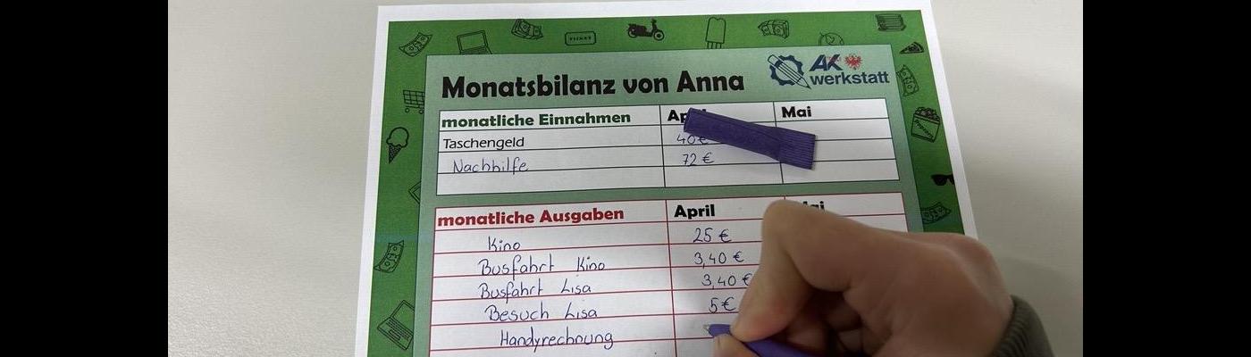 Anhand eines Beispiels – Anna, 14 Jahre, mit einem Kontostand von 500 Euro und dem Ziel, sich ein Moped samt Führerschein zu leisten – erstellten die Schülerinnen und Schüler eine Monatsbilanz. Dabei wurde berechnet, welche Einnahmen und Ausgaben anfallen und wie lange es dauern könnte, Annas Ziel zu erreichen.
