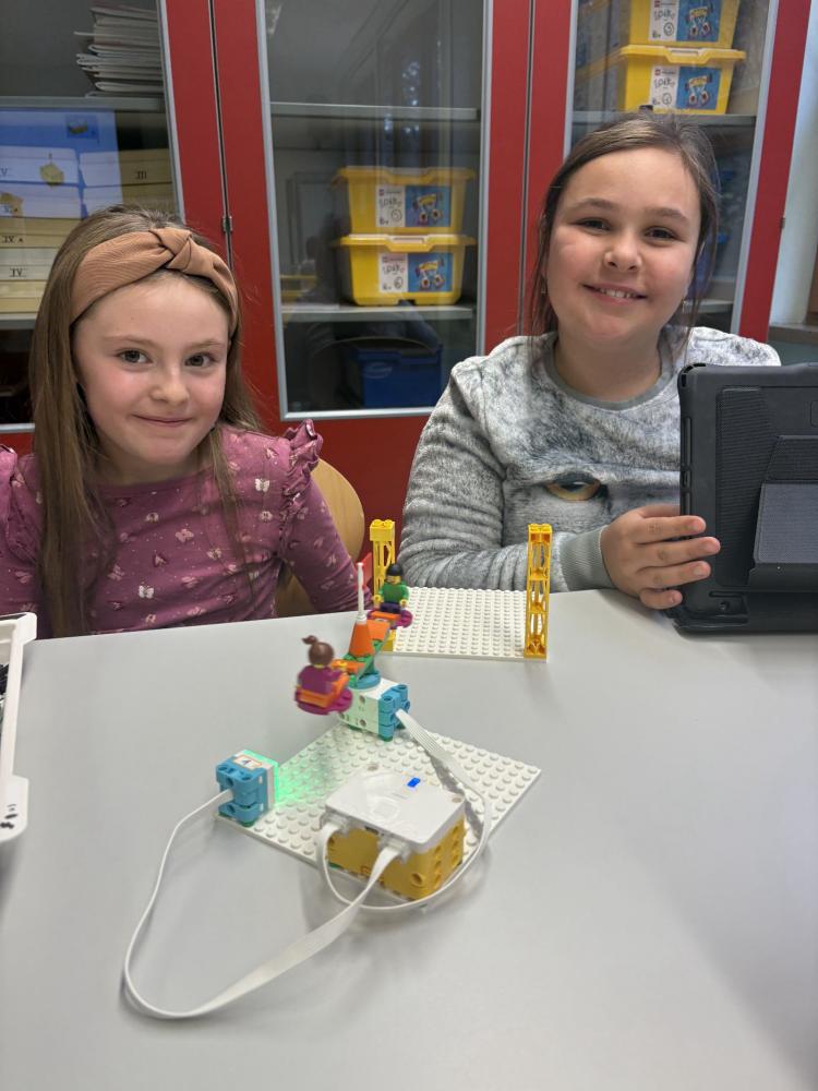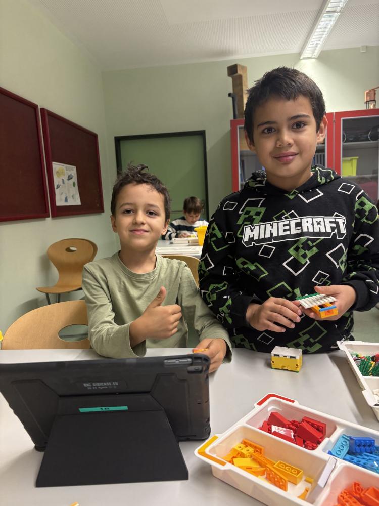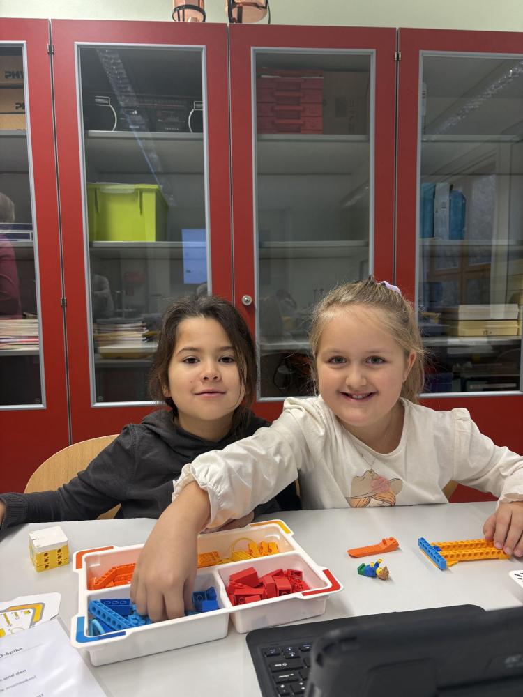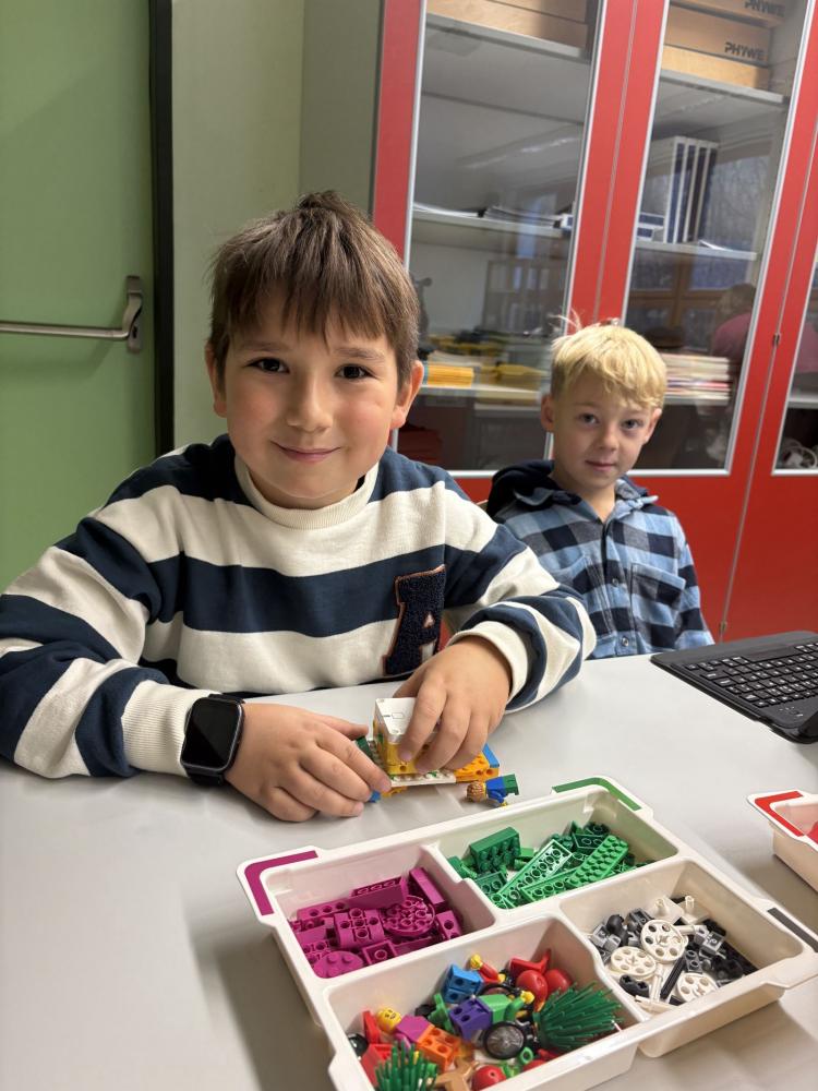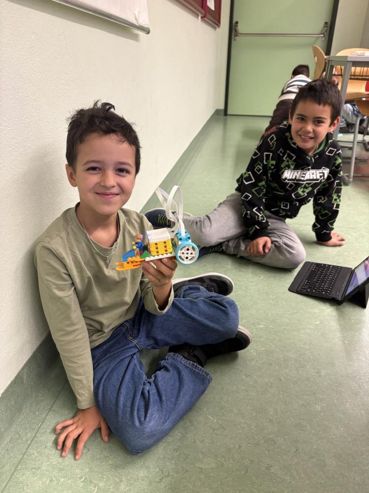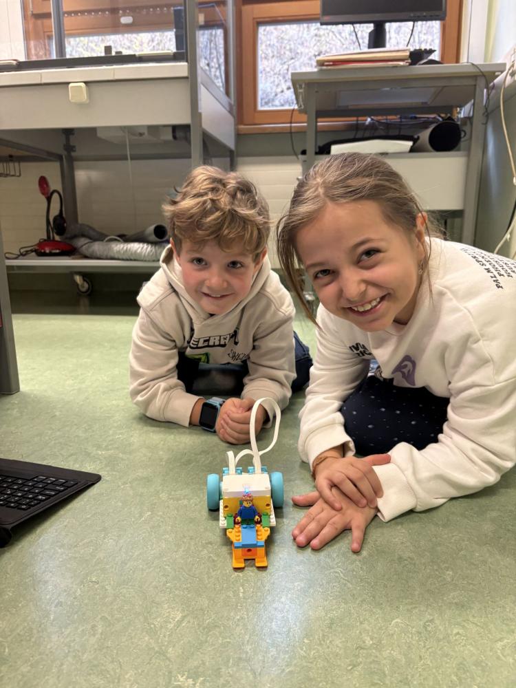 In Teams bauten die Kinder eigene Modelle mit dem LEGO SPIKE Essential Set. Danach programmierten sie die Motoren und Lichtsensoren ihrer Kreationen. Entstanden sind ein fahrendes Schneemobil und ein Karussell, das sich drehte, Musik spielte und blinkte.