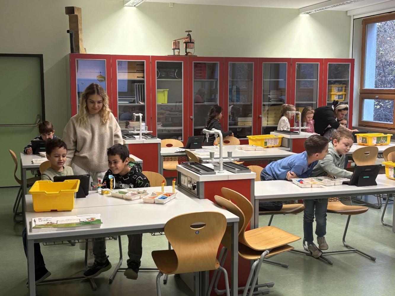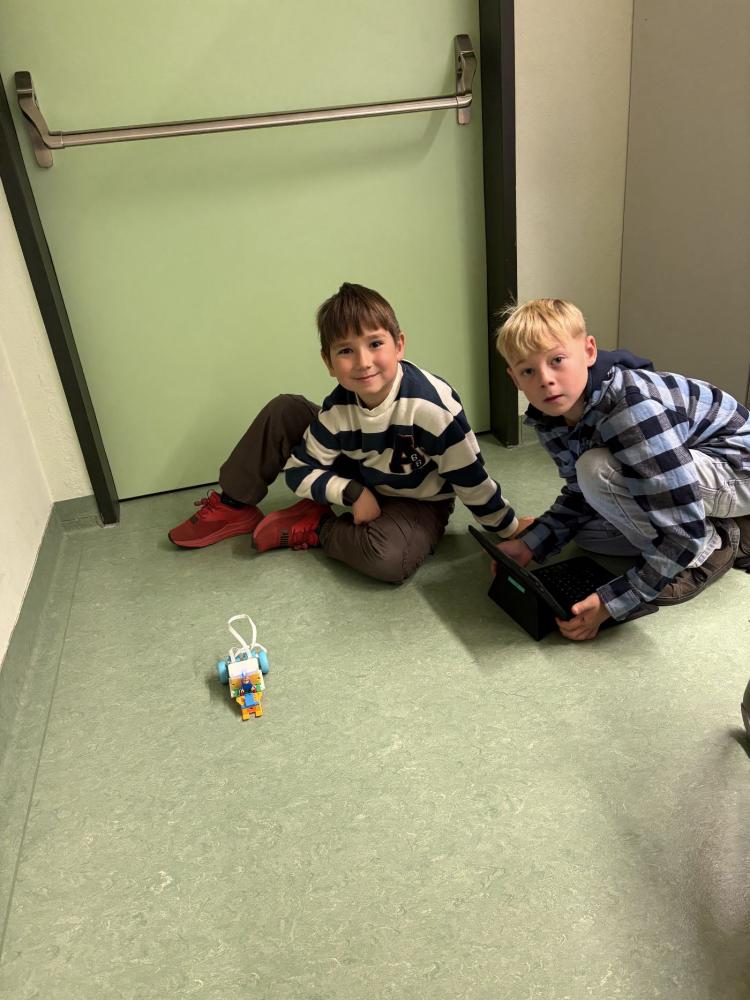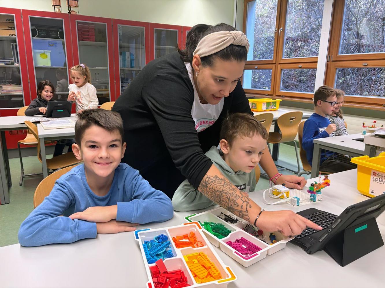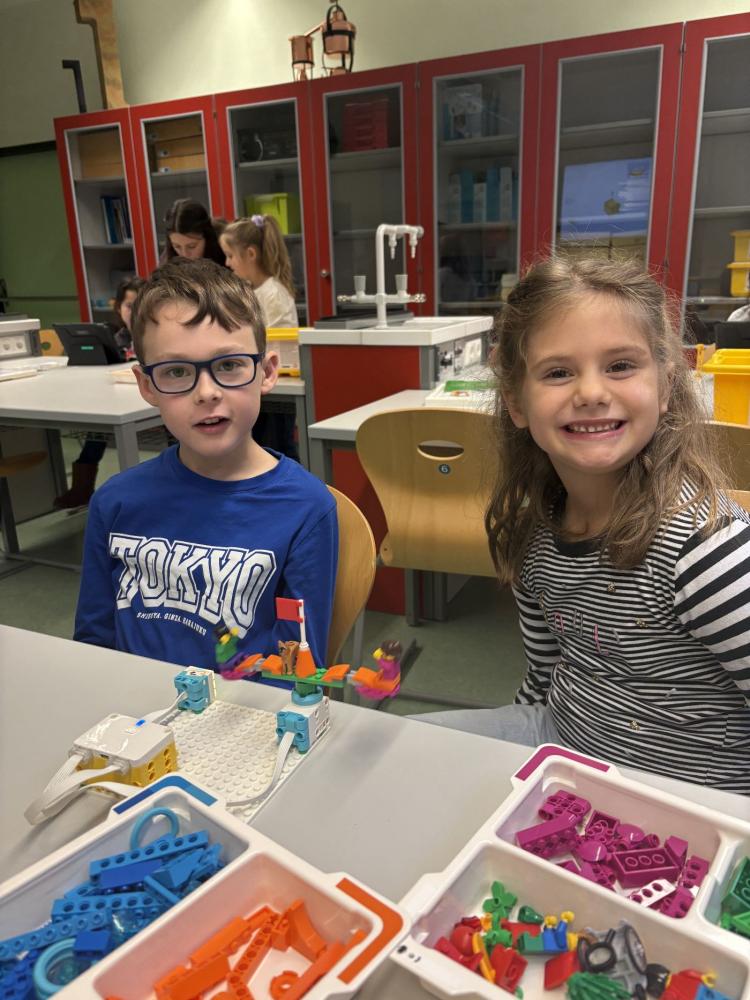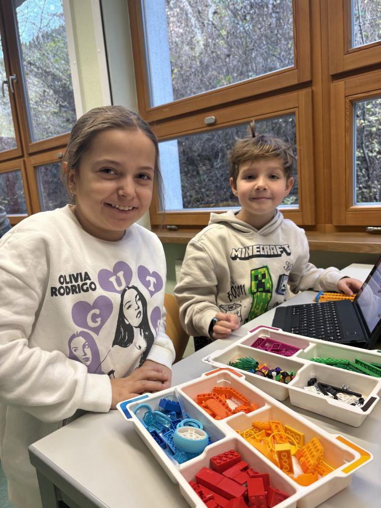In Teams bauten die Kinder eigene Modelle mit dem LEGO SPIKE Essential Set. Danach programmierten sie die Motoren und Lichtsensoren ihrer Kreationen. Entstanden sind ein fahrendes Schneemobil und ein Karussell, das sich drehte, Musik spielte und blinkte.