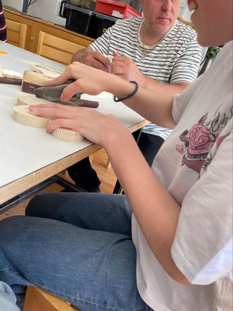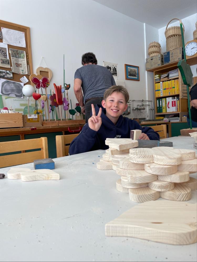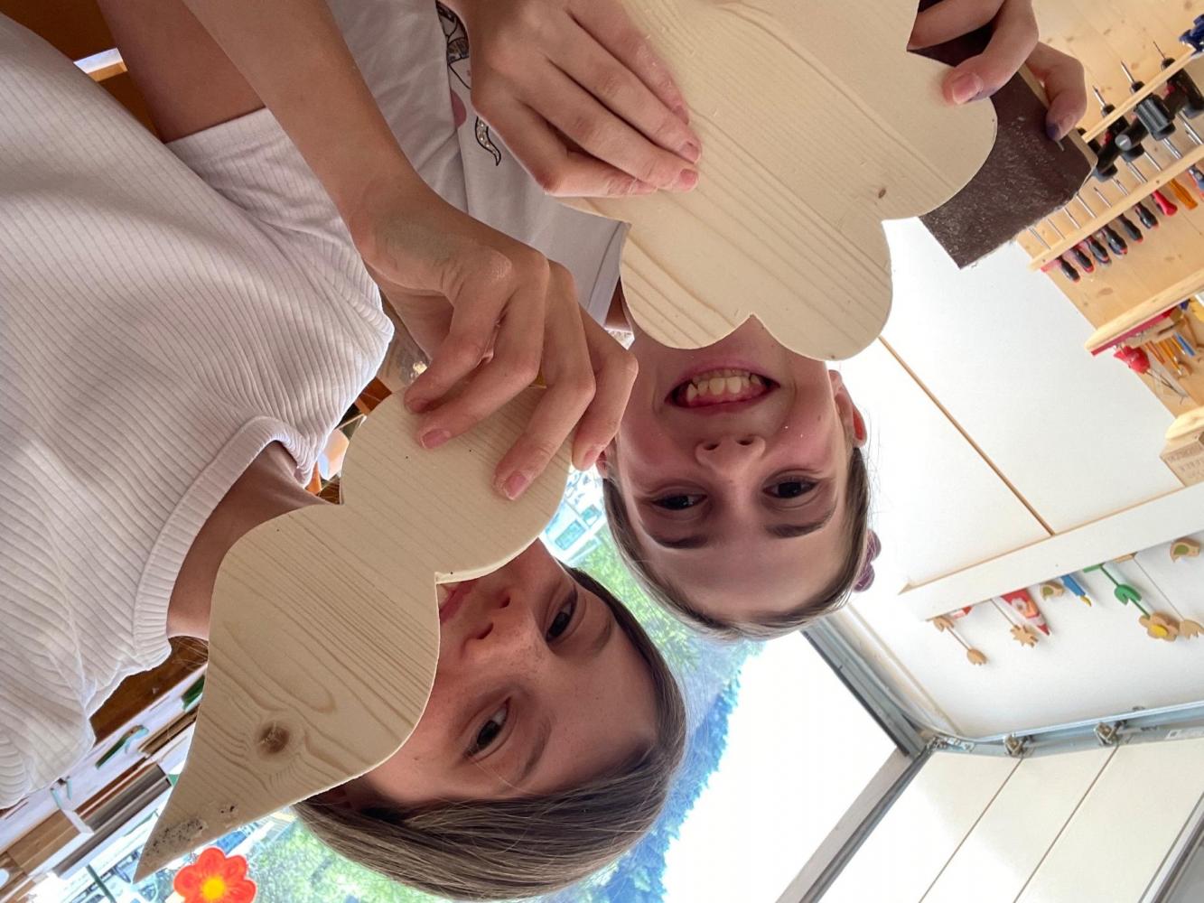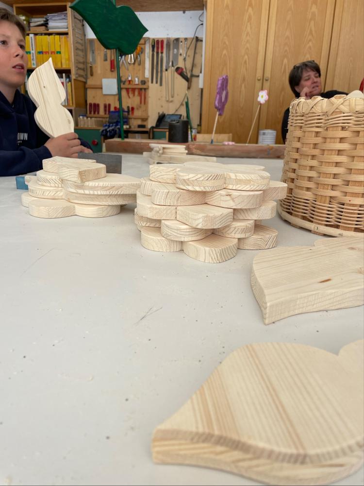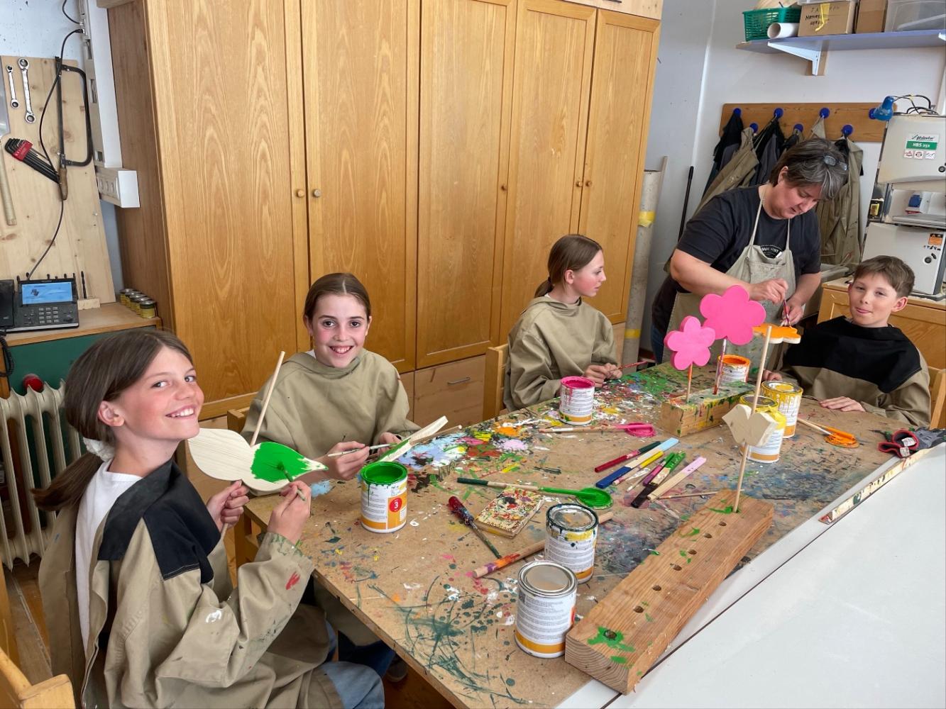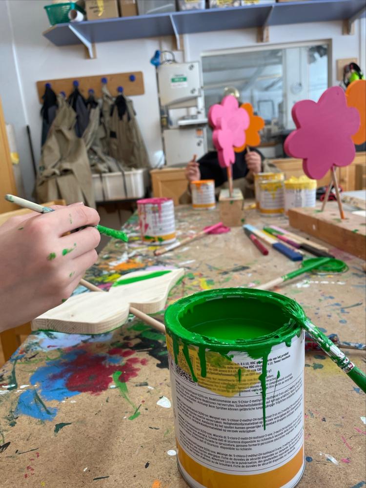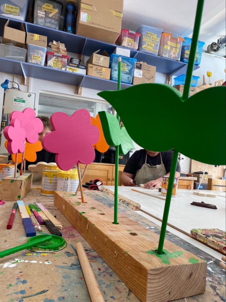 Diakon Armin Schwenninger begleitete die kleinen Handwerker in die Werkstätte der Lebenshilfe! Dort „erblühten“ farbenfrohe Blumen aus Holz, die den Frühling einziehen ließen. Nach getanener Arbeit durfte beim gemeinsamen Unospielen noch viel gelacht werden.